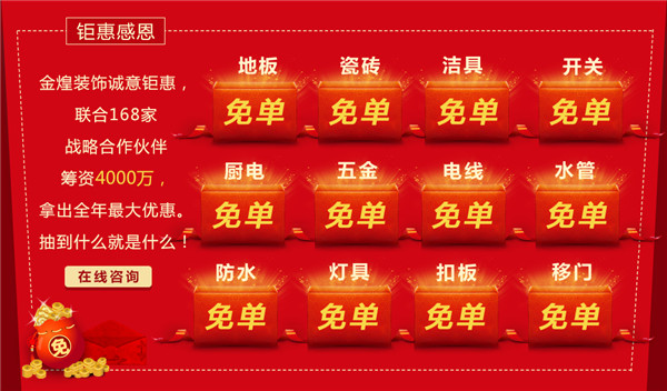 钜惠一:顶尖材料免单,涵盖木地板、瓷砖、卫浴洁具、灯具开关、橱柜、浴室柜、水管、电线、厨电等遍布全房的项目。两次机会,品牌品类齐全任你抽,100%中!