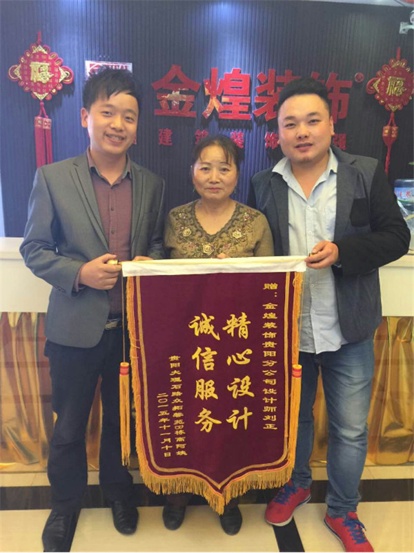 十一月十日,来自众拓馨苑的高阿姨亲临贵阳金煌装饰送锦旗,并对设计师刘正、客服经理张雪玲作出了“精心设计,诚信服务”的高度评价。