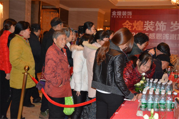 伴随着金煌【2015感恩答谢家装盛宴】的启幕,金煌装饰特浓情推出5000万让利钜惠,上门业主可尊享品质好礼大抽奖、100元免费前往广东—珠海世界级工厂直购建材家具资格,享受正价产品40%工厂让利补贴,名品家具卫浴真正厂价直销,特约爆款直降90%。签单业主还可享受1元抢购格力1.25P空调/普田3件套,50000元环保大礼赠送,6大主材免全房费升级,设计费低至3折及20%金牌施工费全免等特惠。感恩答谢会上,抽奖互动环节一轮接着一轮,业主纷纷领到心仪的奖品,现场热情被集中点燃,场内气氛持续嗨翻。