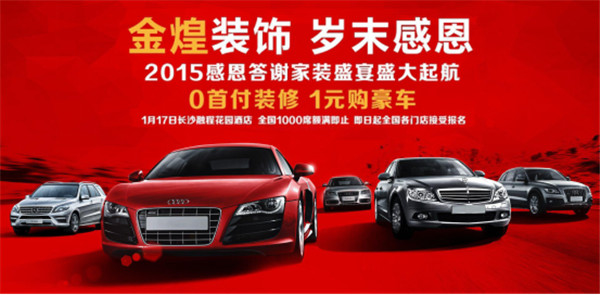 为感念新老客户十四年来的支持与信任,助力业主岁末顺利返家团圆,金煌装饰还将携手奔驰、奥迪、斯柯达建立全国首个汽车、家装行业跨界联盟,年前定下装修的业主均有机会1元将豪车领回家。