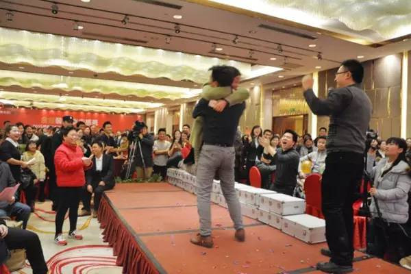 金煌装饰五一总店的客户童女士得知自己抽中第一台汽车大奖,激动得立马冲上舞台拥抱揭奖主持人。