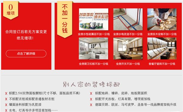 “星级家环保全装”第9代全房标配贝朗、欧派、马可波罗等顶级建材,全包178个项目:全房水电改造、全房开关、全房卧室地板、全房厨卫扣板……不加一分钱,单项标配项目在数量、尺寸、面积上也尽善尽全,所有项目明码标价,是目前行业极质、极全、透明的全包典范工程,全面重击市面上频出的“低价吸引·增项加钱”、“项目不清·收费不明”、“低质建材·污染隐患”等装修痛点。