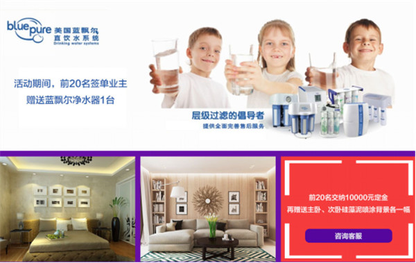 活动期间,前20名签单业主赠送蓝飘尔净水器1台;前20名交纳10000元定金业主,再赠送主卧、次卧硅藻泥喷涂背景各一幅。