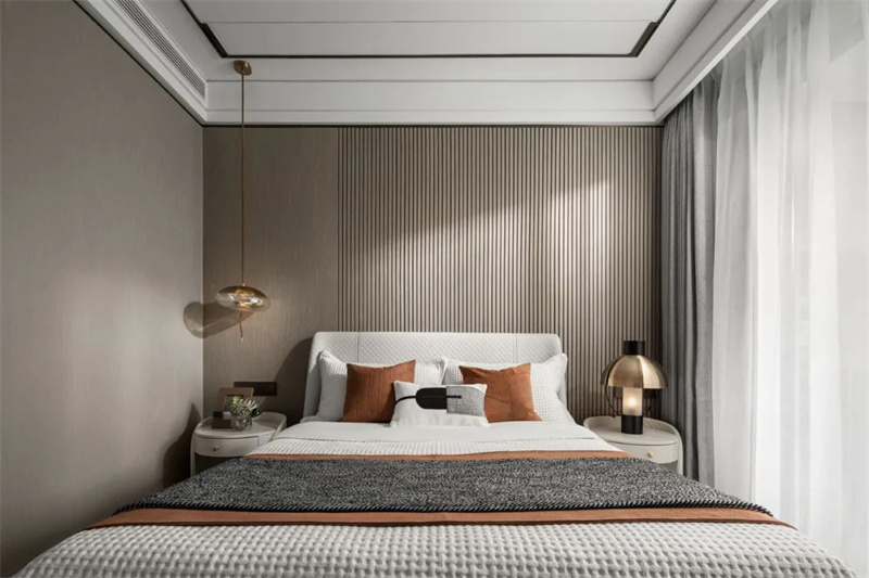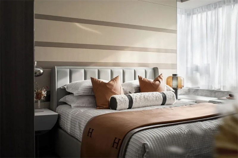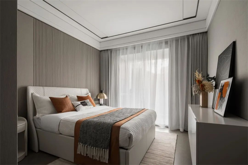 主卧色调以柔和的灰白为主,带来宁静而舒适的氛围。床头靠背采用暖色的软包设计,简洁却极具质感,与木色边柜形成和谐的对比。超大窗户带来卓越的自然采光条件,同时扩大了空间的视觉效果,为房间注入更多的明亮和开阔感。