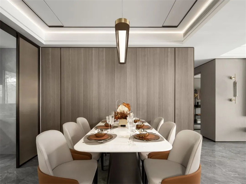 餐厅空间与客厅相连贯,整体宽度充足,居中摆放一套简约岩板餐桌+舒适的皮艺餐椅,让用餐氛围轻松闲适。餐桌上的插花和素雅的餐具恰到好处地点缀着整体设计,既保留了简约的美感,又增添了一抹生机和活力。