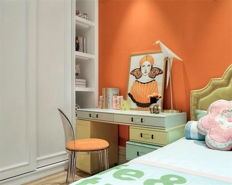 儿童房充满温馨与活力,设计简洁却极具趣味性。房间的主色调以橙色为主,配合原木色地板,营造出轻松愉快的氛围。床头设置了一张书桌,阳台明亮的光线洒入室内,为孩子提供了理想的学习和游戏区域,增添了童趣和活力。