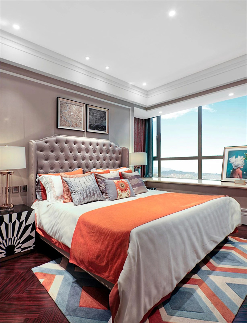 主卧中,优雅与奢华交织成了一幅梦幻的画卷。床头采用软包设计,柔软的天鹅绒床品与大飘窗相互呼应,金属边框的镜子与床头柜上简约的台灯为卧室增添了一丝现代感,同时保持轻奢的调性,使空间既舒适又不失格调。
