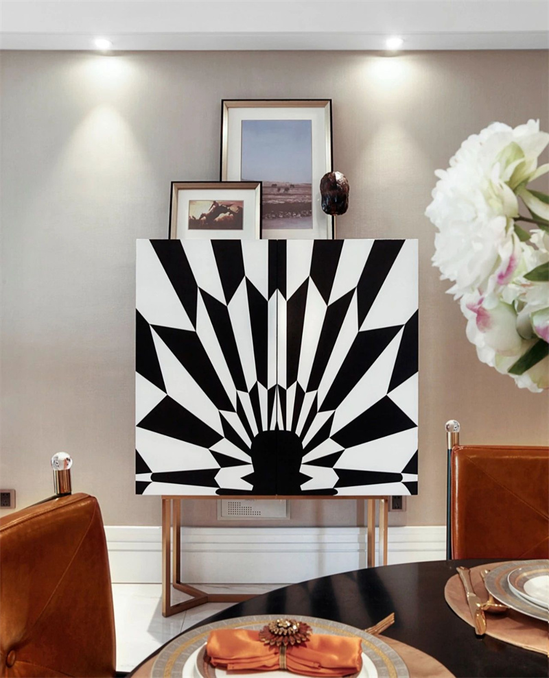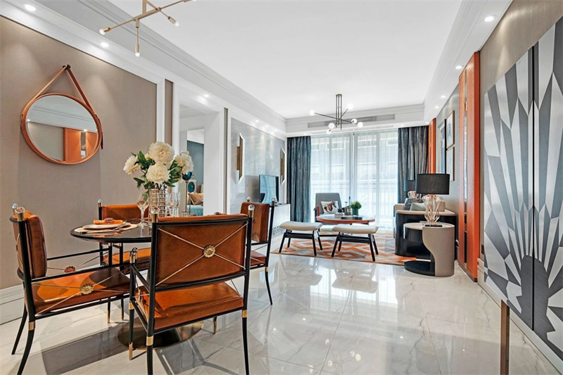 餐厅设计讲究细节与品质的融合。中央的餐桌简洁大气,围绕它摆放着几张极具辨识度的爱马仕橙色餐椅,与同色系的装饰品相互呼应,为餐厅增添了一丝活力和时尚感。餐桌上精致的餐具与花艺装饰,为每一餐的时光赋予满满的仪式感。