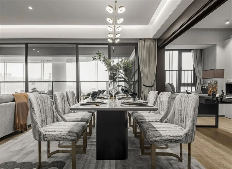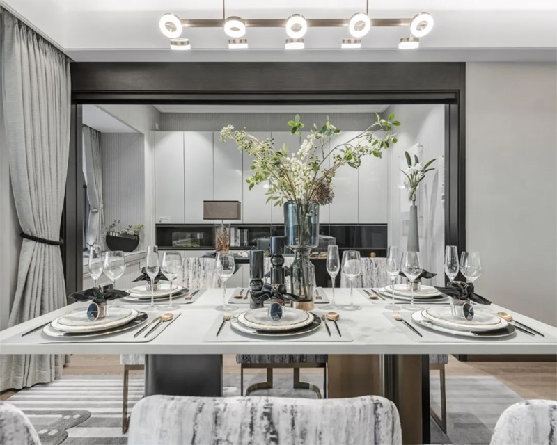 餐厅延续了客厅的风格,餐边柜将定制柜的美观与实用性发挥得淋漓尽致。现代感十足的灯具将温暖的光线投射到大理石餐桌和布艺餐椅上,营造出舒适的用餐氛围。