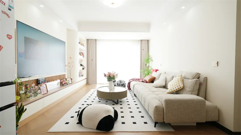 客厅里,米白沙发搭配几何地毯,点缀一抹红喜字与熊猫玩偶,传统与童趣悄然融合,让家在简约中透出满满温度与个性。这不仅是一次装修,更是一种松弛而有爱的生活方式的开启。